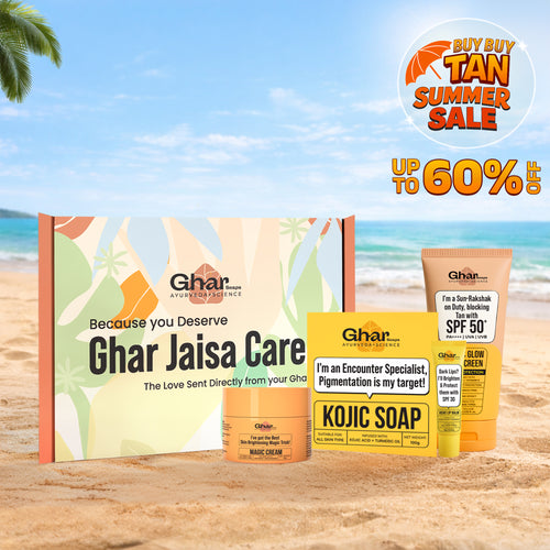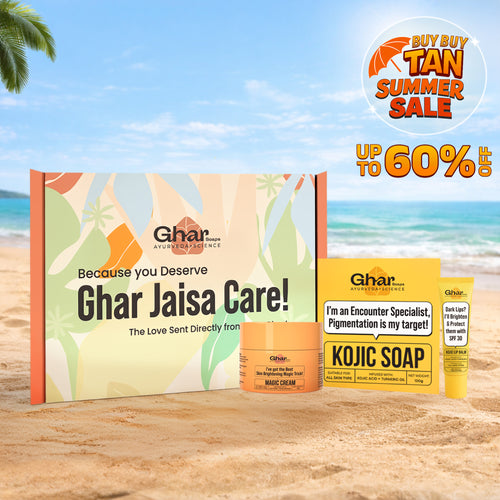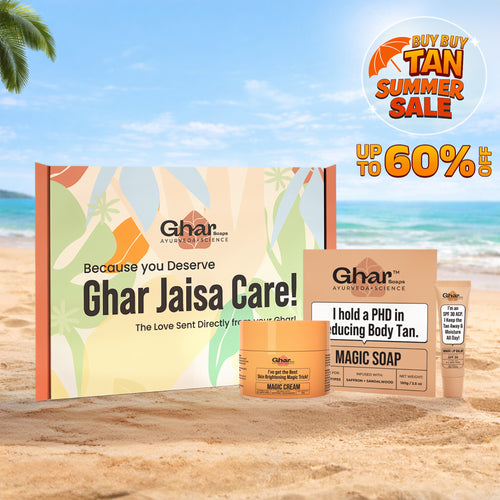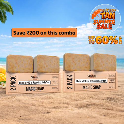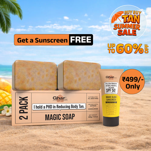Get glowing skin with our Magic Soap Combo made with Saffron, Sandalwood, and Kojic Acid that helps reduce tan and brighten your skin. Buy a Pack of 2 and get a Magic Cream free, go for Pack of 3 or 6 and get a Magic Cream plus Magic Sunscreen free. The more you buy, the more freebies you get – perfect for keeping your skin healthy and glowing every day!