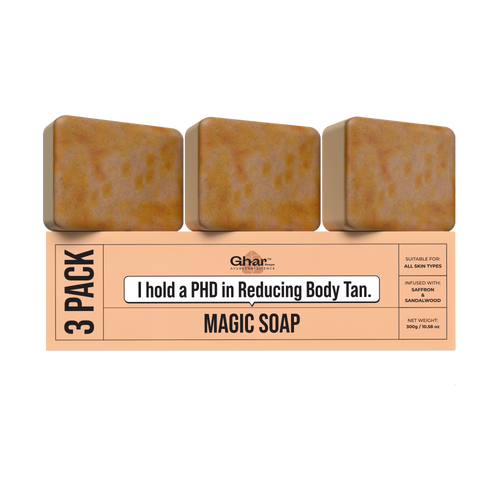 Watch those tan lines vanish with me every day! I'm your De-tan Magician, offering stress-free relief with a delightful fragrance. With saffron, sandalwood, and coconut oil by my side, I'll make your skin radiant, bright, and moisturized.
