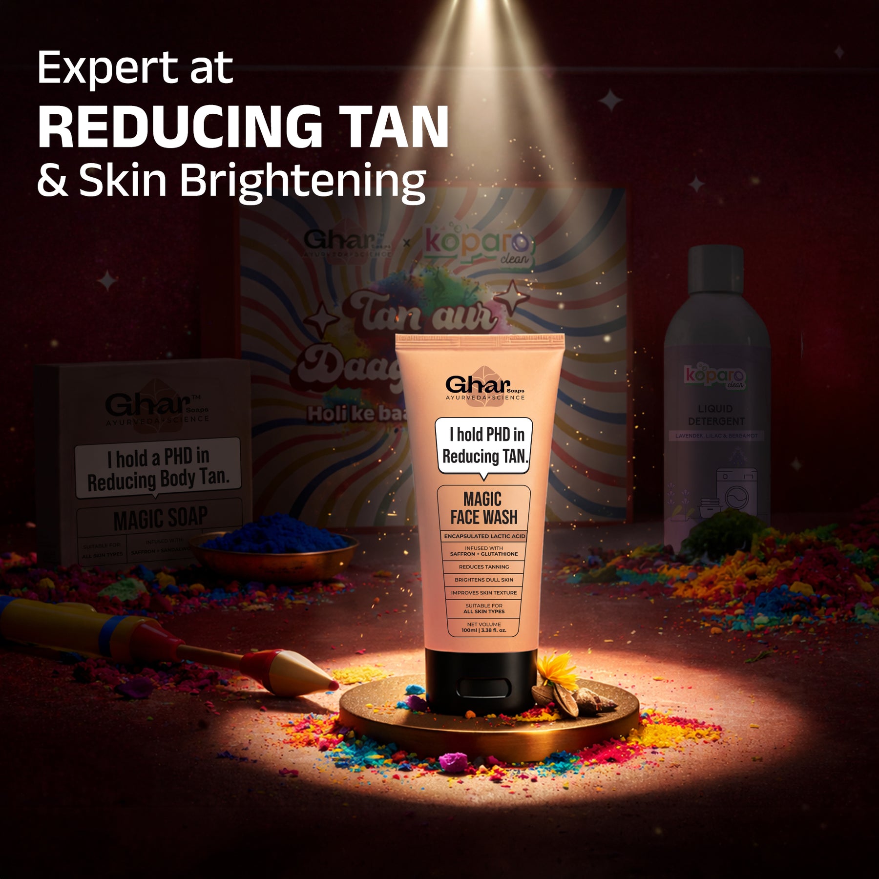 Yes. The Magic Soap and Magic Face Wash help cleanse deeply while gently exfoliating the skin, it helps remove Holi colour residue.