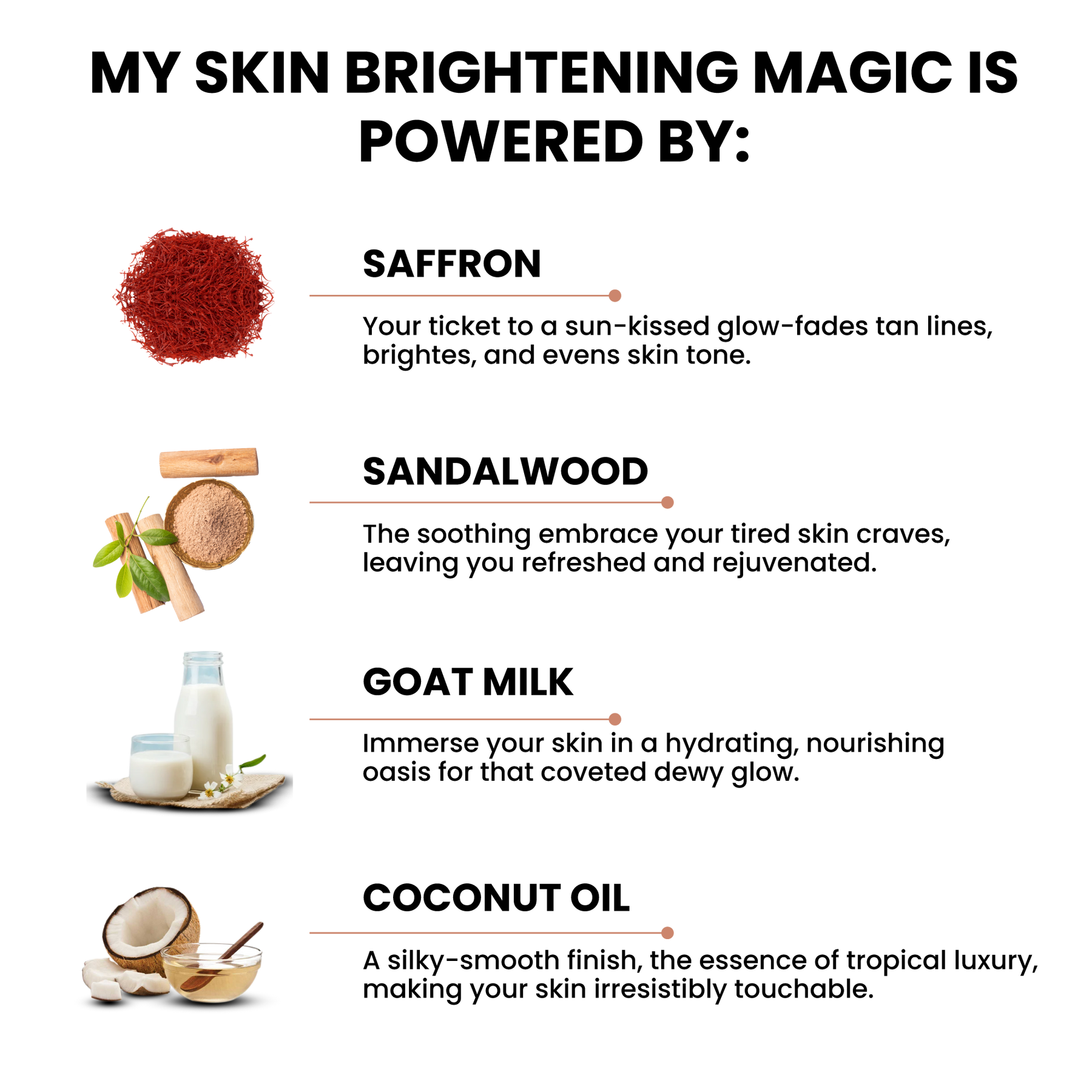 Our magic anti-tan soap is made with gentle and natural ingredients like saffron sandalwood, goat milk, and coconut oil. This best anti tanning soap formulation is safe for everyday use. In fact, this is one of the best de tan soaps in India that can cleanse, hydrate, and brighten your skin without stripping off its natural oils.